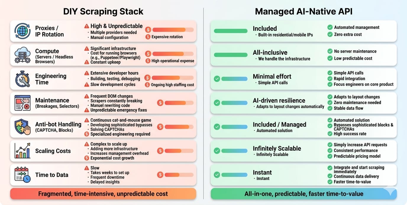 BeautifulSoup is free. The CAPTCHA solvers, rotating residential proxies, cloud-hosted browser fleets, and dedicated engineering hours required to keep it running are not. Opportunity cost is the silent killer in web data extraction.