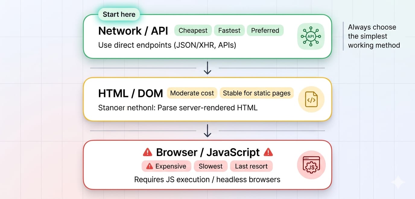 Start with the lowest-cost extraction layer (HttpClient). Escalate to headless browsers (Playwright) only when client-side JavaScript execution is unavoidable.