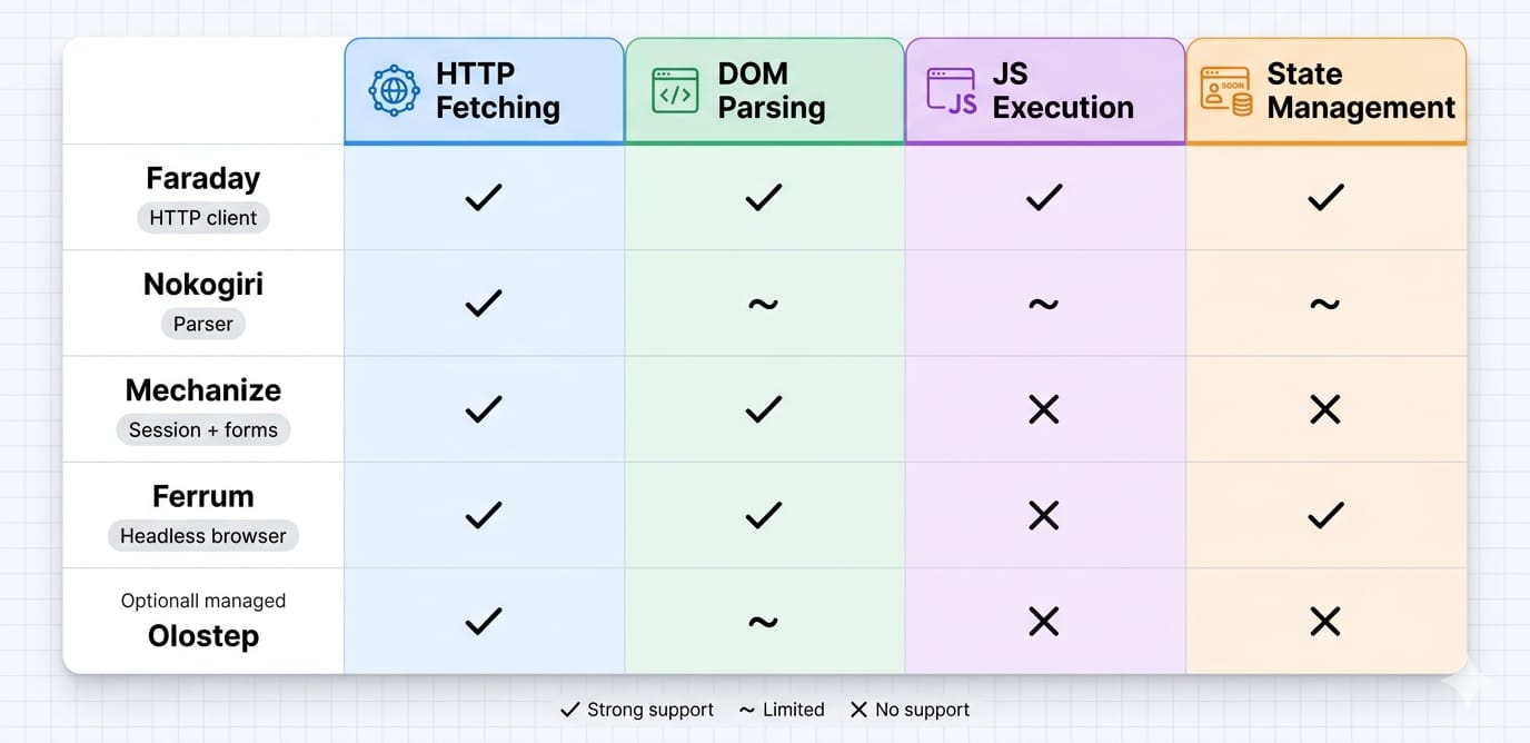 - Nokogiri: Use for HTML parsing. It provides robust CSS and XPath capabilities but cannot execute JavaScript.